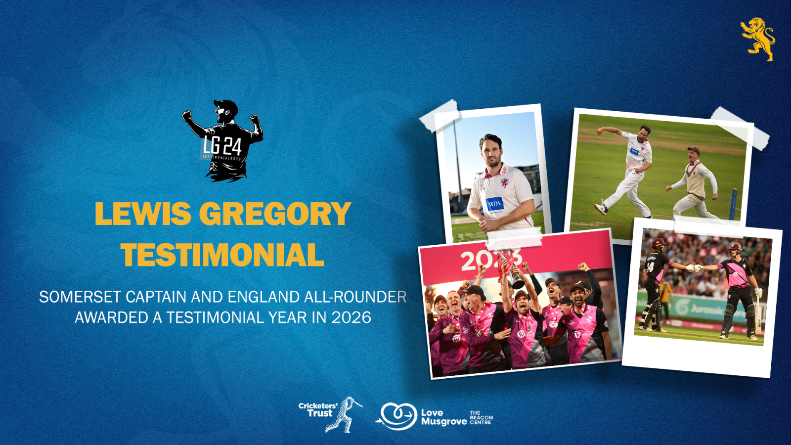 Two-time Vitality Blast-winning Somerset CCC captain, Lewis Gregory, has been awarded a testimonial year in 2026.